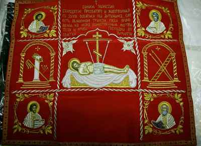 Антиминс (antiminsios) – букв. «вместопрестолие». Это – четырехугольный, из льняной или шелковой материи плат, на котором изображается положение Христа во гроб; по углам помещается изображение четырех евангелистов, а на верхней стороне вшиваются частицы мощей. Антиминс, как и престол, освящается архиереем.