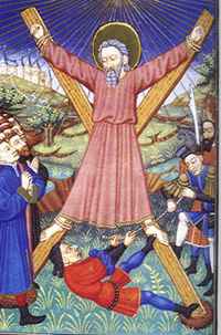 Андрей Первозванный (св. покровитель Шотландии) изображался с косым крестом (обычно серебряным или золотым на синем фоне, т. к. предполагали, что именно на кресте такой формы он был распят). Как и другие святые, которые были рыбаками, он в качестве эмблемы имел рыбу. Кстати, он же считается небесным покровителем России, поскольку проповедовал и на русской земле (в Скифии). По легенде еще в VIII в. мощи св. ап. Андрея были перевезены в Шотландию монахом Регулусом и помещены в кафедральный собор города, который получил своё имя в честь святого (Сент-Эндрюс) и стал церковной столицей Шотландского королевства.