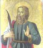 Иаков Младший (Алфееев, брат Христа) изображается с палкой, которой он был убит ударом по голове Симеоном.
