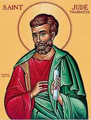 Иуда Фаддей изображался с булавой – символом его мученичества в Персии, посохом или с плотницким «наугольником» – намек на его профессию – а также с веслом, лодочным крюком или с кораблем – символами его миссионерских путешествий. Алебарда – также атрибут св. Иуды, который во время путешествий со Св. Симоном был ею убит.
