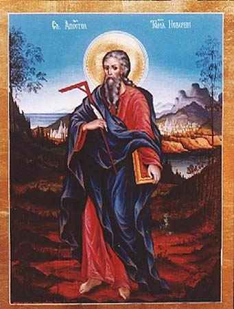 Фома – небесный покровитель каменщиков и архитекторов; его символом служит плотницкий инструмент «наугольник». Так же он порой несет копье, которым был пронзен. Однако чаще всего он смотрит на свои пальцы и проверяет ими раны Христа.