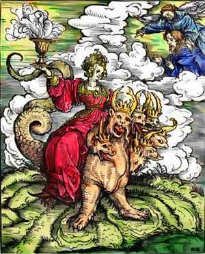 Аллегорический образ, впервые выведенный в «Откровении» Иоанна Богослова. Образ этой демонической женщины, восседающей с Великим Зверем и объяснение связанной с ней символики стали предметом многочисленных богословских толкований и споров. По «Откровению» ангел показал Иоанну развратную женщину «сидящую на водах многих», восседавшую на Звере, багряном, имевшем семь голов и десять рогов. Она была мерзостна; затем сам же ангел пояснил, что воды – это племена и народы, «семь голов суть семь гор, на которых сидит жена, И семь царей, из которых пять пали, один есть, а другой еще не пришел, и когда придет, не долго ему быть… И десять рогов, которые ты видел, суть десять царей, которые еще не получили царства, но примут власть со зверем, как цари, на один час… Жена же, которую ты видел, есть великий город, царствующий над земными царями». Образ блудницы применялся еще ветхозаветными пророками применительно к Вавилону, притеснявшему израильтян. В христианскую эпоху его применили к Риму, а в Средние века начали применять даже к римскому папе, обличая его грехи. Лютер применил этот образ ко всей римско католической церкви.