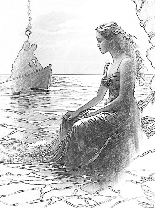 Красоты чужеземных местМеня к себе манили с детства!И навык есть, и храбрость есть.И вот уже сорвался с места!Покинул я свой дом родной,В порту пираты приютили.Отринул робость и покой!И той же ночью мы отплыли.Скитались долго по морям.Чего мы только не видали!Свои бросали якоряЛишь, где сокровищ обещали!И вот однажды за бортомОткрылся остров нашим взорам.Никто из нас не знал о нём,И разожглись меж нами споры!Но капитан решил за нас!Корабль к берегу причалил.И, получив его приказ,Мы месяц остров изучали.Но не было сокровищ здесь,Скотины чудной не водилось,Лишь по ночам звучала песньИ девушка команде снилась.Случилось, сон меня покинул,И я решил к воде пойти.У берега её увидел!Она запуталась в сети.Я подойти к ней не решался,Но взгляд её меня молил!Мол, помоги мне, чужестранец!И я русалку отпустил…Она, хвостом своим ударив,Пустилась тут же по воде!И с той поры она не пела.И снилась ночью только мне.С тех пор прошло уж много лет.Вернулся я давно домой.Но всё хранил в душе портретТой, что украла мой покой!И вот однажды, как в начале,В порту корабль меня встречал.Лишь я от берега отчалил,Её мне голос зазвучал…