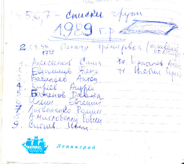 «…списки групп 1989 года рождения, 2.09.1999 Первая тренировка (основная команда), 17:00. 1. Алексеев Саша 2. Евдокимов Женя 3. Васильев Антон 4. Киреев Андрей 5. Баженов Павел 6. Ильин Евгений 7. Логвиненко Роман 8. Амиглобелли Робин 9. Сигнев Иван 10…11…»