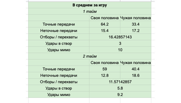 Таблица 2. Средняя статистика за пять матчей в Чемпионате Санкт-Петербурга (в процентах)