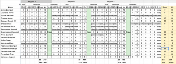 Чтобы определиться с практическими занятиями, мне с Румянцевым пришлось потратить много часов на согласование упражнений на тренировках. Мы должны были научить команду защитному действию – быстро сокращать расстояние между мячом и собой. Команде не хватало физических кондиций, чтобы научиться такому действию. Поэтому я давал индивидуальные задания, которые учитывались баллами. В итоге, только два человека подготовили себя выше, чем за 50%. И это два игрока замены: Матвеев и Бурдуковский. Вся остальная команда показала 28% результата запланированной работы. Очень низко для желания попасть в финал всероссийского турнира.