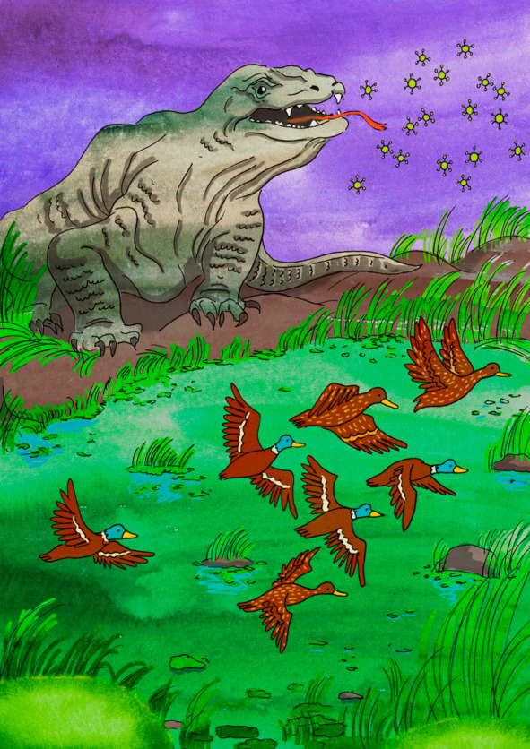 На остров Комодо дракон прилетел.Сей остров для жизни себе присмотрел.Тепло и красиво, и много воды,Олени пасутся, и куча еды.А чтобы вкусняшки себе раздобыть,Решил он всех гриппом А заразить.Сначала на уток он взор обратил,В них вирус внедрил и по миру пустил.