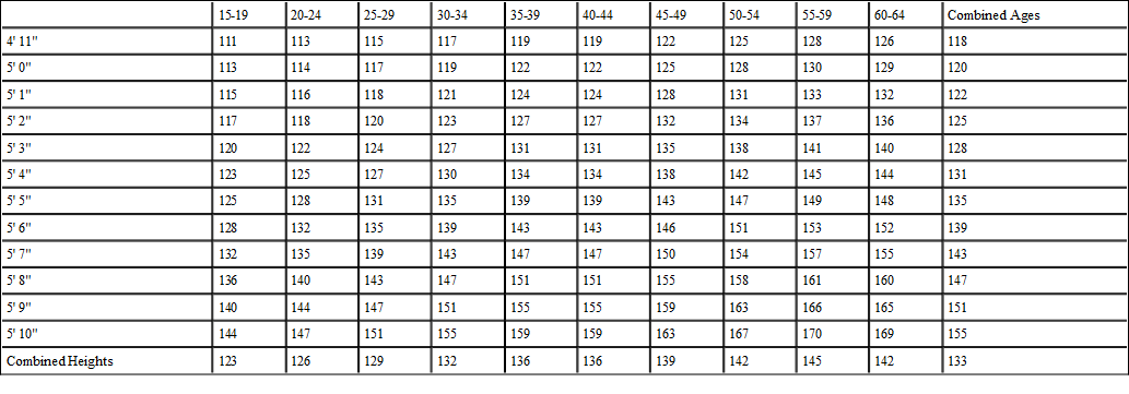 ADJUSTED TABLE OF WEIGHTS FOR INSURED WOMEN, BASED ON 58,855 ACCEPTED LIVES