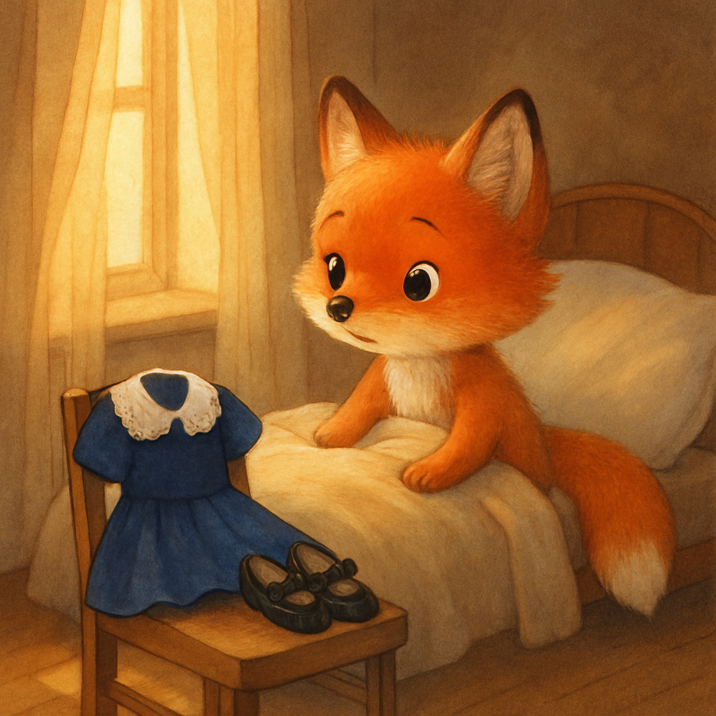 Алисия открыла глаза, потянулась лапками – и вдруг заметила что-то важное и необычное. На краешке стула, рядом с кроватью, лежало аккуратно разложенное новое синее платье с белым кружевным воротничком. Рядом – черные лакированные туфельки с бантиками.