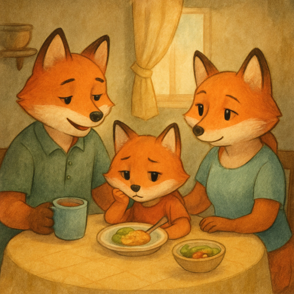 Алисия сидела за круглым деревянным столом, подперев щёчку лапкой. Перед ней стояла тарелка с любимым блюдом, но еда будто потеряла вкус. Она ковыряла вилкой кусочек и молчала.