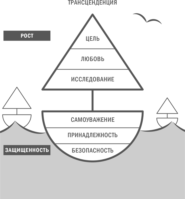 Наконец, наверху новой иерархии должна находиться потребность в трансценденции, которая выходит за пределы личностного роста (и даже здоровья и счастья) и открывает простор для выхода на высшие уровни единства и гармонии с собой и миром. Трансценденция, опирающаяся на прочный фундамент безопасности и роста, – это перспектива, позволяющая нам взирать на все свое бытие сверху с чувством принятия, глубокого знания и принадлежности к человечеству в целом.