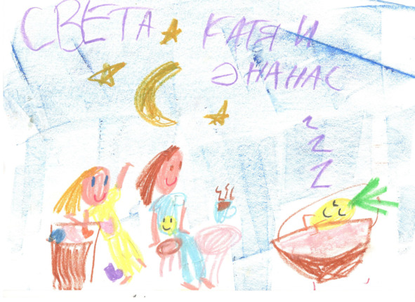 – Йо-ху! Время веселиться! – сказала Катя, вытащила из шкафа диско-шар и включила музыку. Света, Катя и Энанас танцевали. А шар-ананас? Он был крепко привязан к Катиной кровати и радовал всех своим золотым блеском и сиянием.