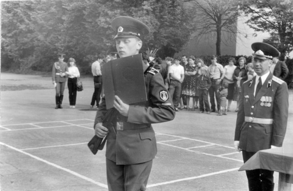 Знаменная группа занимает свое место на правом фланге. Перед строем устанавливают покрытые красным сукном столы. На них, в красных кожаных папках, текст Присяги и подписные листы. У столов – начальники курсов. «Курсант Келпш, для принятия Военной Присяги выйти из строя!» Чеканю шаг изо все сил, поворот кругом у стола, в руках папка с текстом Присяги.
