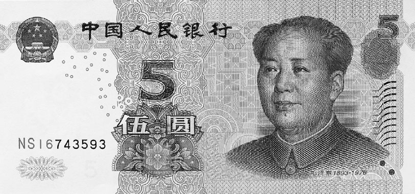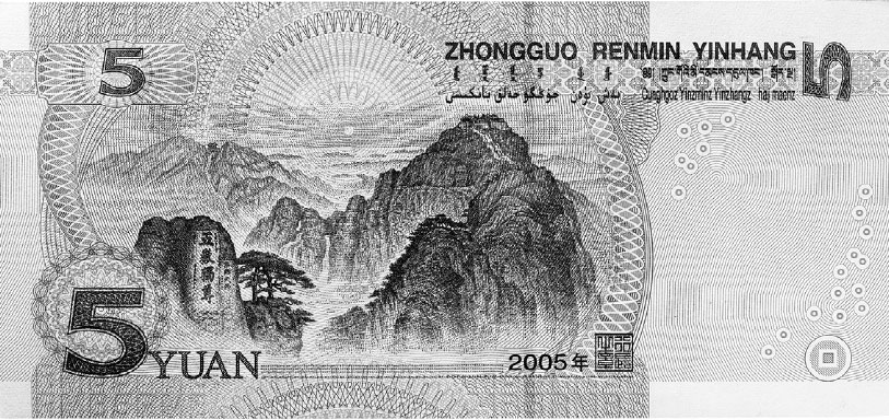 Банкнота достоинством в 5 юаней образца 2005 года. На новых банкнотах изображены объекты национального значения в Китае, например гора Тайшань, избранная для самой распространенной банкноты в обращении
