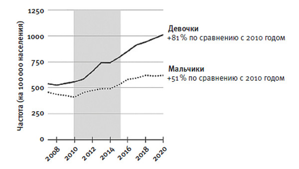 Рис. 1.4. Посещение отделений неотложной помощи из-за самоповреждений. Частота обращений американских подростков 10–14 лет в отделения неотложной помощи с нелетальными повреждениями, нанесенными самостоятельно (на 100 000 населения). (Источники: Центры США по контролю и профилактике заболеваний, Национальный центр профилактики и контроля травматизма.)[56]