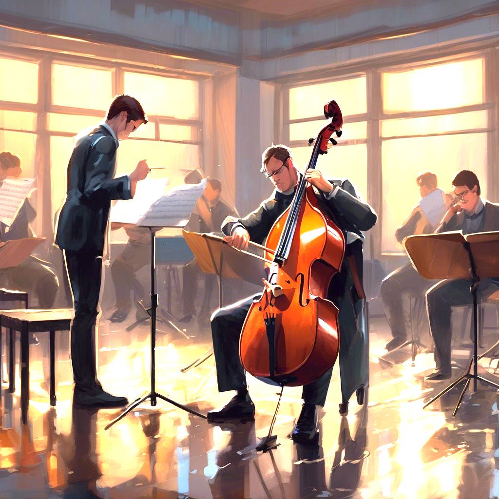 ЧК: – Ну а теперь самое интересное. Репетиционные будни. Настраиваем камеры на дневной свет и снимаем репетицию «Похорон Охотника». А кто это у нас с недовольным видом подкручивает колки и натирает смычок канифолью? А, это Юрий, со своим питомцем-контрабасом.