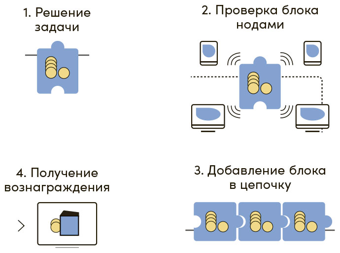 Каждый блок биткоина создается в результате решения криптографической задачи, представляющей собой определенную абстрактную последовательность вычислений. Всю работу выполняют компьютеры-майнеры. Другие ноды проверяют (валидируют) решение, и, если оно верное, блок добавляется в блокчейн. Взамен майнер получает награду в виде криптовалюты. Этот процесс требует значительных вычислительных ресурсов и расхода электроэнергии. Такой метод добавления новых блоков в блокчейн называется механизмом Proof-of-Work (PoW).