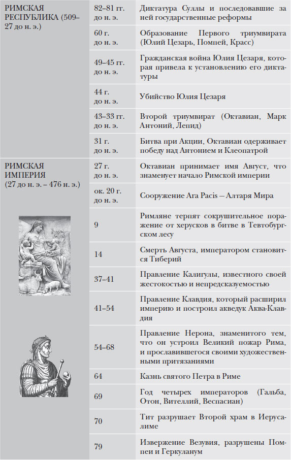 Ромул, Рем и волчица / Cebas / iStock; Самнитский воин / Sunny Celeste / Alamy Stock Photo; Ганнибал / Fratelli Alinari / Wikimedia Commons; Сулла / Wikimedia Commons; Цезарь / Wikimedia Commons; Алтарь Мира (Ara Pacis) / piola666 / iStock; Ian Dagnall / Alamy Stock Photo; Термы Каракаллы / фотография автора; Колонна Траяна / Matthias Kabel / Wikimedia Commons