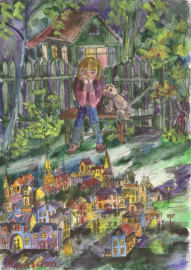 Вечер. Догорает костёр. Я бросаю картошку в раскаленные угли. И долго-долго стою и смотрю на бесчисленные огоньки. На что же они похожи? На небо! На летнее звёздное небо! И ещё на ночной город! Только очень маленький, а может быть просто – очень далёкий. Я внимательно всматриваюсь в каждый уголёк. И вот я уже вижу: яркие окна домов, фонари и нарядные улицы, украшенные разноцветными гирляндами. Сегодня здесь праздник! Самый любимый и долгожданный для жителей этого города.