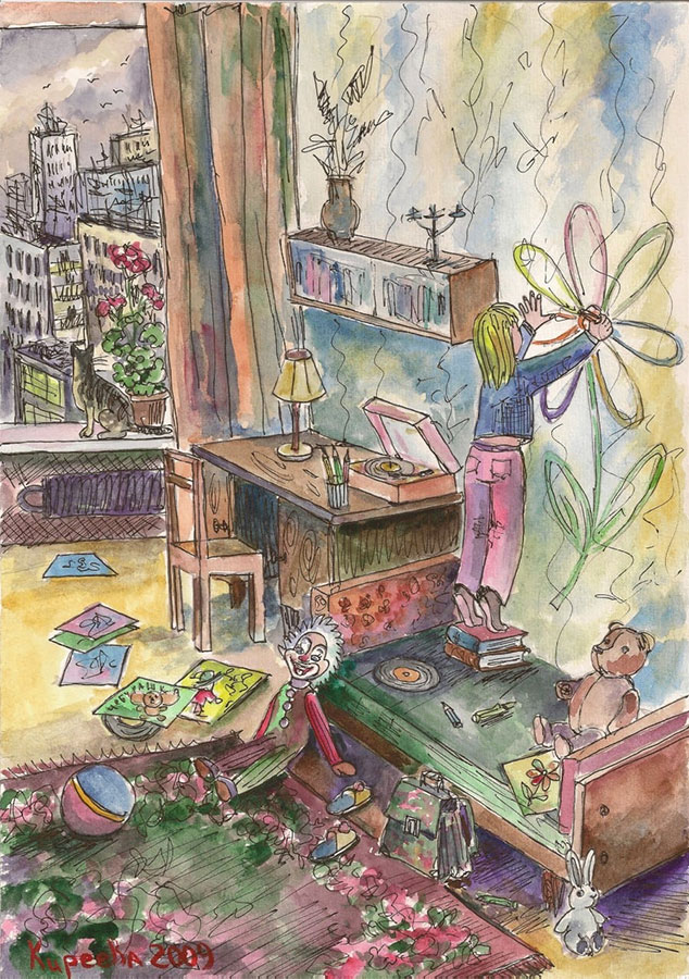 Я подхожу к тумбочке и достаю пластинки. У меня много интересных пластинок: про Незнайку, про Снежную королеву, есть про Чебурашку и про Голубого щенка, но сегодня я, пожалуй, послушаю… про Цветик Семицветик.