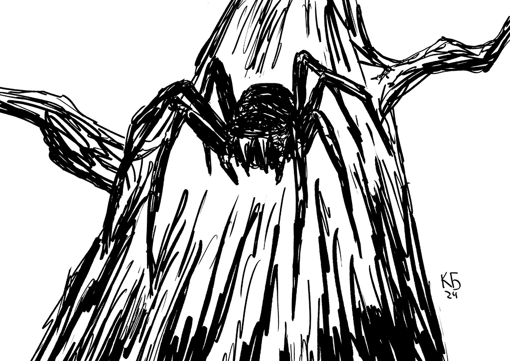 Далеко наверху, как будто у самого неба, ехидно покачивались верхушки деревьев. А по стволу ближайшей к Джэйгэ лиственницы спускался, перебирая скоро-скоро острыми лапами, огромный, размером с крупную собаку, паук!