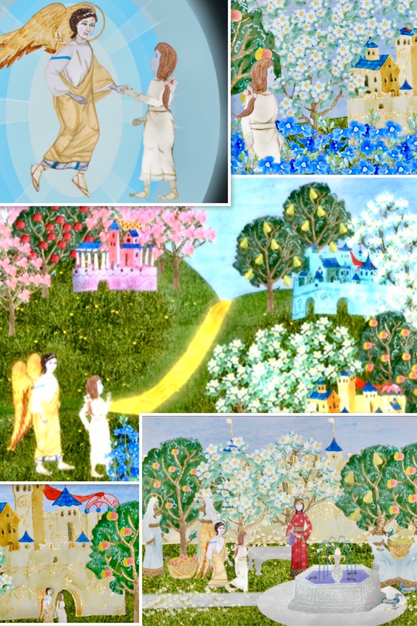Катя подала ему руку, и в ту же секунду они вспорхнули из комнаты и понеслись ввысь. Родительский дом, деревня, город, а затем и земной шар стремительно удалялись, белая ночная рубашка ее бесшумно колыхалась на ветру, а затем Бог весть каким образом развернулись перед ночными спутниками Новое небо и Новая земля. Здесь не было не зимы, не ночи. Катя с Ангелом теперь продолжали лететь над цветущим благоухающем полем, над плодящими деревьями, толщина стволов которых свидетельствовала о многовековом их возрасте. В садах этих гуляли красивые кроткие животные и в ветвях деревьев селились и летали пестроперые птицы. Наконец повсюду насколько мог обозреть глаз, на горах, холмах и равнинах виднелись прекрасные обители из драгоценных сверкающих камней, устроенные с великолепным художеством нечеловеческой рукою, как казалось, много веков назад. Добрые и счастливые люди жили в них, ходили друг другу в гости, не имели иной радости, как служить ближнему каждый от своего умения и совместными хорами славить благость Пресвятой Троицы.
