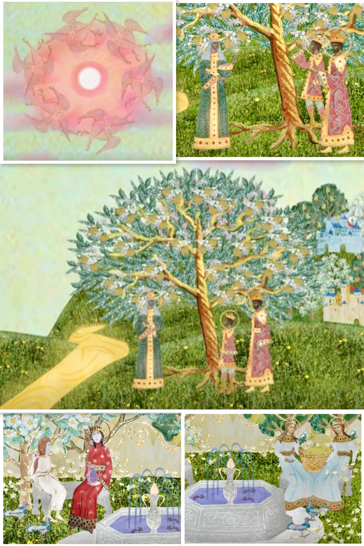 После чего они вместе прошли за ограду. Здесь их взору предстало множество прекрасных зданий из красных и розовых камней родолита, родонита и родохрозита все различных оттенков утопающих в зелени, плодящих и цветущих деревьев и кустов. Одна из аллей привела путников к хрустальному фонтану, из которого бил источник чистой воды. Ее черпала в стеклянный кувшин прекрасная девушка в легком тёмно-розовом кружевном платье с царским золотым венцом на голове. В саду возле фонтана другие девицы также в золотых диадемах, в белоснежных платьях срывали с деревьев спелые яблоки и груши и складывали их в корзины. Сизые голуби прохаживались возле них, подлетали к источнику и пили из него своими красными клювиками.