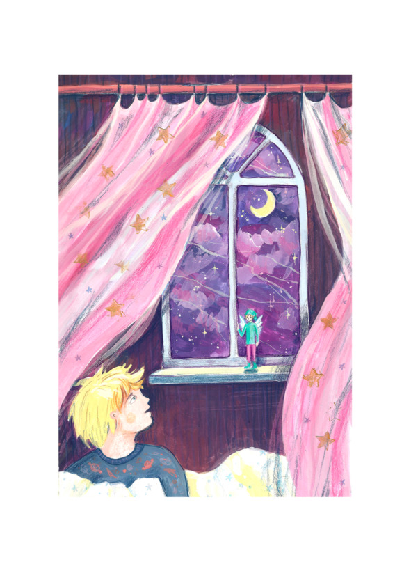– Привет! Посмотри на верх окошка! Только не пугайся, я добрый. Я твой эльф домашних окон. Мне очень понравились человечки, которых ты сегодня рисовал. Я даже подумал, что ты рисовал меня.
