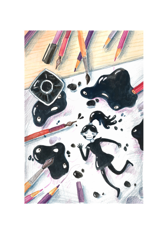 Перо выпрыгнуло и само нарисовало кляксу, похожую на маленькую девочку. Она ожила и звонко проговорила тоненьким голоском: