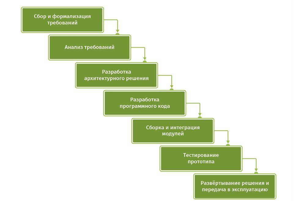 В конце прошлого столетия доминирующей методологией разработки программного обеспечения была так называемая «водопадная модель» (или «каскадная модель»): последовательное выполнение заранее определённых этапов, каждый из которых занимает существенное время и завершается достижением заранее согласованных результатов, при этом переход на следующий этап во многих случаях происходит после полного и формального завершения предыдущего этапа (Рис. 1).
