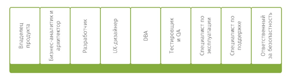 В отличие от такой схемы, в DevOps деление специалистов производится по командам, и каждая команда работает над своим продуктом. Будучи самодостаточной, команда включает в себя и владельца продукта, и архитекторов, и разработчиков, и тестировщиков, и ответственных за эксплуатацию, и за информационную безопасность (Рис. 5).