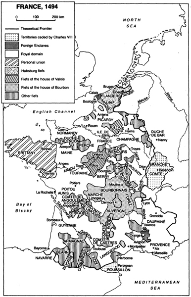 At the beginning of the sixteenth century France was still only partially developed as a nation. She still lacked well-defined borders, a common language and a unified legal system. The eastern frontier, in so far as it existed at all, followed roughly the rivers Scheldt, Meuse, Saône and Rhône from the North Sea to the Mediterranean. People living west of this line were vassals of the French king; those to the east owed allegiance to the Holy Roman Emperor. French suzerainty over Artois and Flanders was purely nominal, effective control of these areas having passed to the house of Burgundy. Further east, the frontier cut across the duchy of Bar whose ruler, the duke of Lorraine, did homage for half the territory to the king of France and for the other half to the emperor. In the south, Dauphiné and Provence, being east of the Rhône, were still not regarded as integral parts of the French kingdom: the king was obeyed as ‘Dauphin’ in the one, and as count in the other. The south-west border more or less followed the Pyrenees, avoiding Roussillon, which belonged to the kingdom of Aragon, and the small kingdom of Navarre, ruled by the house of Albret. Within France, there were three foreign enclaves: Calais belonged to England, the Comtat-Venaissin to the Holy See and the principality of Orange to the house of Chalon. Some great fiefs also survived, including the duchies of Brittany and Bourbon.