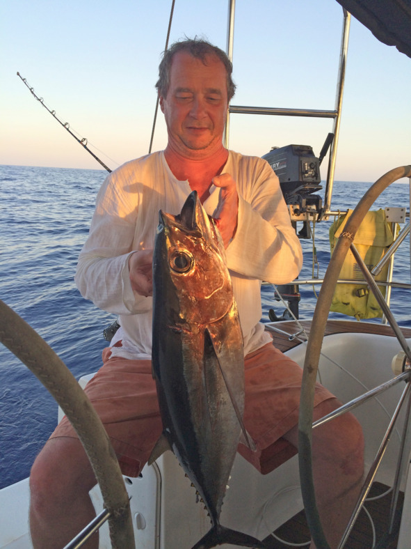 Два раза мощно клевали какие-то монстры, чуть удилище из рук не вырвали, а ведь под парусом скорость сразу не сбросишь. Днём подошли к острову Тира, затопленный огромный вулкан Санторини. Прошли с юга на север внутри кратера, отвесные стены которого поднимаются вверх на 500 метров и уходят вниз на такую же глубину. На закате, как и положено, в 19:30 клюнуло, красиво подтащили, Лёша красиво зацепил багром, и вот он на палубе – красивый 8-килограммовый тунец. Карпаччо!!! Нарезал тартар на ужин и пожарил двухминутку в панировочных сухарях. Сегодня ночью останавливаться уже негде, острова кончились, идём на южную часть полуострова Пелопоннес. Пока курс бейдевинд, ветрогенератор уверенно справляется с зарядкой батарей. Днём вообще нет проблем, солнечные батареи с лихвой покрывают все затраты, а вот когда стихает ветер ночью, приходится экономить, выключать компьютер и автопилот, идти по компасу и рулить руками.
