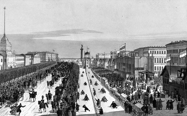 «Масленица во всей Европе есть время торжества забав, – писал Павел Свиньин, – а для русских главнейшее удовольствие составляют ледяные горы»149. Катальных гор было всегда две (их высота достигала 13–18 метров); они сооружались параллельно друг другу, но в разных направлениях – скатами навстречу. Вот как описывает академик Иоганн Готтлиб Георги горы конца XVIII века: «Здесь бывало построивали обыкновенно ежегодно к сырной неделе две публичные горы на Неве. Каждая состоит в кубической подмостке из бревен в 6 сажень вышины, снабденной с одной стороны лестницею для входа, а с другою – крутым, несколько волнистым дощатым скатом, покрытым льдом для спуска и пр. Сие увеселение столь нравится народу, что и простые женщины и молодые люди лучшего состояния в оном участвуют. Некоторые молодые люди столь искусны в том, что спускаются с горы без санок на ногах или коньках»150,151. Горы украшались елками, флагами, деревянной скульптурой, а иногда и «першпективными картинами». «Для зимнего катанья употреблялись санки и лодки, обитые сукном, на стальных полозьях на „головашках“; у одних было резное изображение льва, а у других лебедя»152. Вечером горы освещались фонарями: «отражение сей массы разноцветных огней в снегу, мешаясь с тенями, представляет необыкновенное зрелище»153.