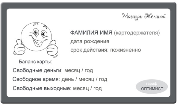 Для этого нам нужно сделать небольшой расчет, после чего мы с вами сделаем свою индивидуальную платежную карточку, которой можно будет рассчитываться, покупая товары в магазине желаний.