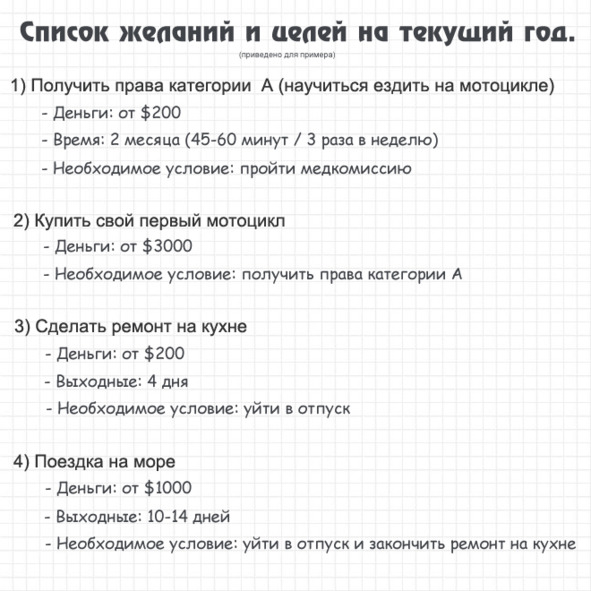 А теперь давайте сделаем очень полезное дело. Попробуйте выписать 3—4 важных для вас желания или цели на листочек. Именно те, которые вы хотите реализовать в течение года. Это могут быть не только какие-то крупные покупки, но и значимые для вас личные достижения.