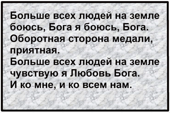 Если поставить меня перед выбором – больше люблю я Бога или больше боюсь, я отвечу – часто примерно пятьдесят на пятьдесят. Многое уж слишком меняется и часто. В сердце моём. Постоянно одно только, точно могу сказать, ибо Бог явил – верую я…