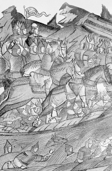 Битва русских с ордынцами на реке Боже в 1378 г. Миниатюра XVI в.
