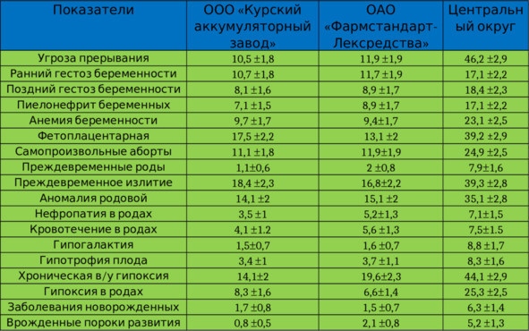 Таблица 1 – Показатели патологии репродуктивной функции женщин на ОАО «Фармстандарт-Лексредства», ООО «Курский аккумуляторный завод» и в Центральном округе г. Курска