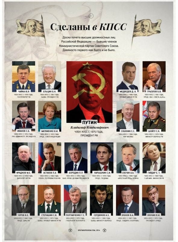 – Главный аналитика КГБ Н. Леонов: «Как вы можете себе представить, что всё члены Политбюро ЦК КПСС, вчера ещё сторонники общественной собственности на средства производства, внезапно становятся сторонниками частной собственности. Вчера они были все атеистами, и на другой день побежали все: кто в православный храм, кто в мечеть, кто в синагогу. Все считали себя интернационалистами, и вдруг стали яростными националистами. Разве так может преступно переродится на глазах всего общества элита? Вся элита оказалась предательской» (из интервью Николая Леонова телеканалу ITV в 2017 году).