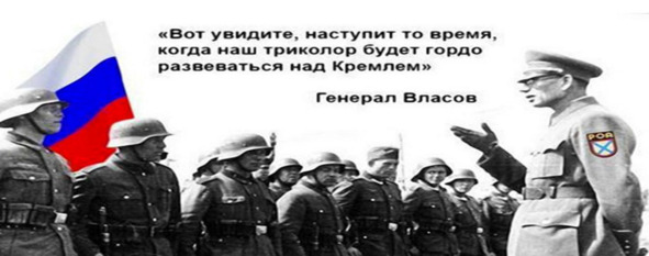 – Генерал Власов А. А., как спаситель Москвы от немецко-фашистских захватчиков генерал А. А. Власов в 1941 г., но уже в 1944 г. «переобулся» и призывал Советский народ бороться с большевизмом в союзе с фашизмом: «… мой долг заключается в том, чтобы призвать Русский народ к борьбе за свержение власти большевиков, к борьбе за мир для Русского народа, за прекращение кровопролитной, ненужной Русскому народу войны за чужие интересы, к борьбе за создание Новой России, в которой мог бы быть счастливым каждый русский человек» [286]. (рис. 4)