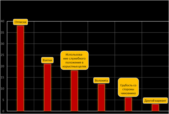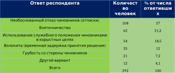 Результаты опроса свидетельствуют о том, что под коррупцией понимаются: «отписки» (38,6%), «взяточничество» (21,7%), «использование служебного положения чиновниками в корыстных целях» (18,4%), «волокиту» (12,7%). Существенных отличий в социально-демографических характеристиках при анализе не выявлено.