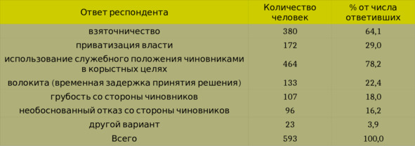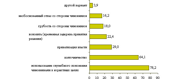 Результаты опроса свидетельствуют о том, что под «коррупцией» понимаются явления, не только связанные с самими органами власти, но и с злоупотреблением государственными и муниципальными служащими своего служебного положения в личных корыстных целях. Так, большинство респондентов понимают под коррупцией «использование служебного положения чиновниками в корыстных целях» (78,2% ответивших на данный вопрос), «взяточничество» (64,1%). Понимание «коррупции» как социального явления, неизбежно связанного с «приватизацией власти» отмечается почти каждым третьим опрошенным (29,0%). Существенных отличий в социально-демографических характеристиках при анализе не выявлено. Также респондентами были отмечены такие явления, как волокита и необоснованные отказы со стороны чиновников. Наибольшая частота фактов волокиты и необоснованных отказов приходится на сферу жилищно-коммунального хозяйства. Равным образом были отмечены факты взяток и использования служебного положения в личных целях. Среди причин существования коррупции наиболее часто отмечаются отсутствие общественного контроля (в 54,0% ответов), низкий нравственный уровень чиновников (в 52,8% ответов респондентов) и несогласованность и противоречие законов (в 51,8% ответов). Практически все опрошенные считали, что бороться с коррупцией нужно непременно (74,2%) и скорее всего необходимо (18,8%) и среди респондентов, желающих бороться с коррупцией преобладали люди с высшим образованием до 50 лет [72].