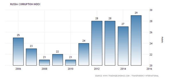 Неправительственная международная организацияпо борьбе с коррупциейи исследованию уровня коррупции по всему миру Трансперенси Интернешнл (Transparency International) начала рассчитывать индекс восприятия коррупции для России с 1996 г. В 1996 г. индекс рассчитывался для 54 стран. Для России его значение составило 2,6 балла (46—47 места). Такое же значение индекса было и у Индии. В 1997 г. индекс рассчитывался для 52 стран. Значение индекса для России составило 2,3 балла (49 место). В 1998 г. индекс был рассчитан для 85 стран. Значение индекса для России составило 2,4 балла (76 место). В 1999 г. индекс был рассчитан для 99 стран. Значение индекса для России составило 2,4 балла (82 место). Такое же значение индекса было, например, и у Эквадора. В 2000 г. индекс был рассчитан для 90 стран. Значение индекса для России составило 2,1 балла (82 место). Такое же значение индекса было у Кении. В 2001 г. индекс был рассчитан для 91 страны. Значение индекса для России составило 2,3 балла (79 место). Такое же значение индекса было у Эквадора и Пакистана. В 2002 г. индекс был рассчитан для 102 стран. Значение индекса для России составило 2,7 балла (86 место). Такое же значение индекса было у Кот д’Ивуара, Гондураса, Индии, Tанзании и Зимбабве. В своей речи, посвященной публикации Индекса восприятия коррупции 2002 г. председатель Трансперенси Интернешнл Питер Айген отметил, что: «Недавние шаги Президента Владимира Путина по проведению налоговой реформы и новых законов по борьбе с отмыванием денег демонстрируют возможность смягчения восприятия коррупции в России, но ИВК-2002 указывает, что России предстоит еще длинный путь, так как она по-прежнему остается сильно коррумпированной страной, получившей наравне с Узбекистаном, Грузией, Украиной, Казахстаном, Молдовой и Азербайджаном менее 3 баллов из 10». В 2003 г. индекс был рассчитан для 133 стран. Значение индекса для России составило 2,7 балла (79 место). Такое же значение индекса было у Мозамбика. В 2004 г. индекс был рассчитан для 146 стран. Значение индекса для России составило 2,8 балла (90 место). Такое же значение индекса было у Гамбии, Индии, Малави, Мозамбика, Непала, Танзании. В 2005 г. индекс был рассчитан для 159 стран. Значение индекса для России составило 2,4 балла (126 место). Такое же значение индекса было у Албании, Нигера, Сьерра-Леоне. В 2006 г. индекс был рассчитан для 163 стран. Значение индекса для России составило 2,4 балла (121 место). Такое же значение индекса имели Бенин, Гамбия, Гайана, Гондурас, Непал, Филиппины, Руанда, Свазиленд. В 2007 году – 2,3 балла (143 место из 179 стран), в 2008 году – 2,1 балла (147 место из 180 стран). В 2009 г. Россия занимала в рейтинге организации Трансперенси Интернешнл146 место. При этом российский коррупционный рынок оценивался в 300 млрд долларов. В 2010 г. Россия заняла 154 место (всего исследованы 178 стран). В пресс-релизе Центра антикоррупционных исследований и инициатив «Трансперенси Интернешнл – Р», в частности, утверждалось: «… никаких кардинальных изменений не произошло. С коррупцией в нашей стране все как было плохо, так плохо и осталось». В 2011 г. был составлен «Индекс взяткодателей», подготовленный Transparency International, согласно которому при зарубежных операциях российские компании являются самыми коррумпированными из 28 исследованных стран. В 2011 г. Россия заняла 143 место (всего исследованы 182 страны). В Индексе восприятия коррупции в 2012 г. Россия набрала 28 баллов и зан