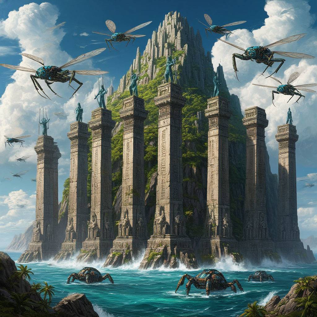 Это был очень необычный город. Издалека были видны девять огромных колонн, на которых сверху стояли огромные статуи атлантов с трезубцами в руках. Все было таких невероятных размеров, что у ребят открылись рты от удивления. Статуи терялись в облаках, колонны исполинские держали их. Ярослав прокричал: