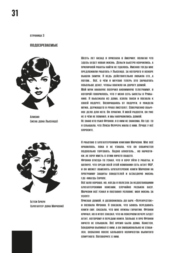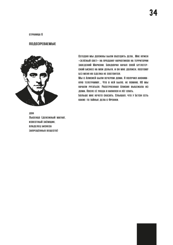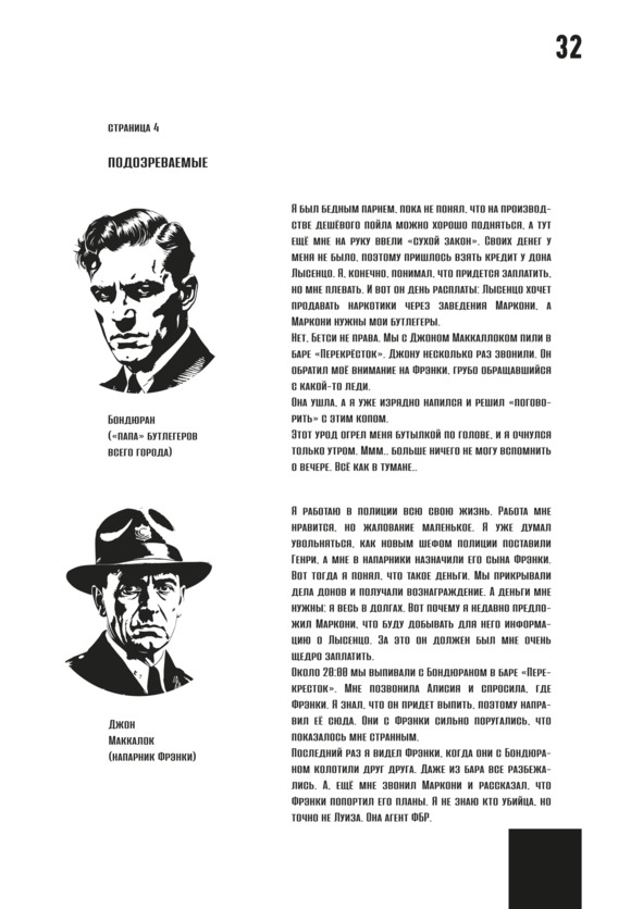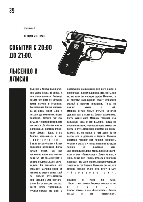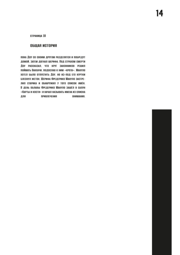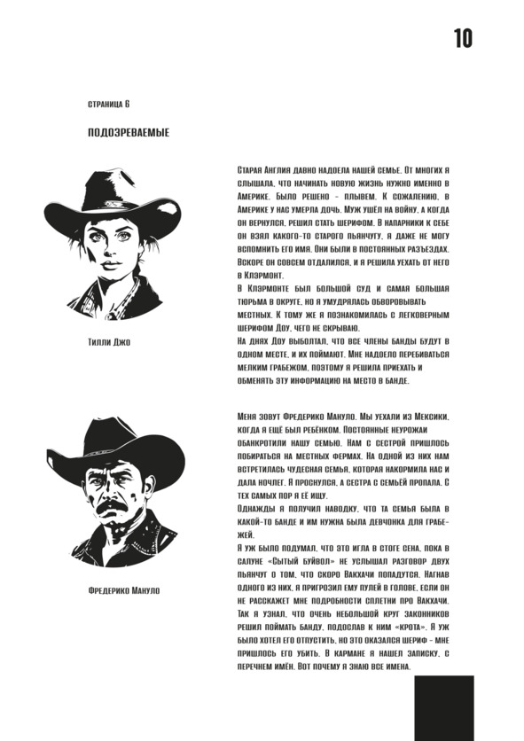 Я уж было подумал, что это игла в стоге сена, пока в салуне «Сытый буйвол» не услышал разговор двух пьянчуг о том, что скоро Вакхачи скоро попадутся. Нагнав одного из них, я пригрозил ему пулей в голове, если он не расскажет мне подробности сплетни про Вакхачи. Так я узнал, что очень небольшой круг законников решил поймать Вакхачи, подослав к ним «крота». Я уж было хотел его отпустить, но это оказался шериф – мне пришлось его убить. В кармане я нашел записку, с перечнем имён. Вот почему я знаю все имена.