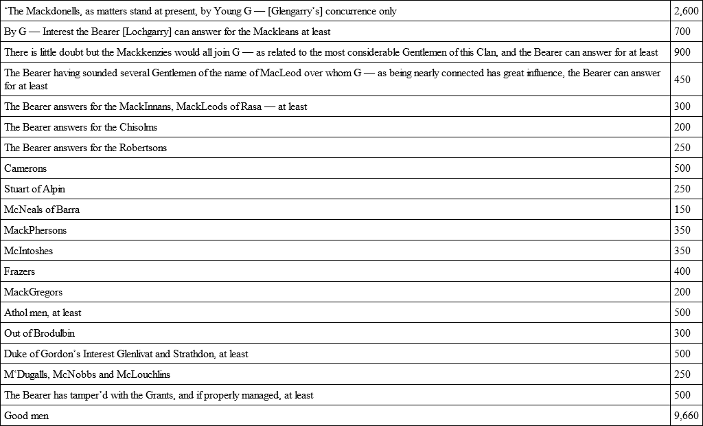 ‘A List of the Clans given by Loch Gairy to the Pretender in consequence of their agreement with him‘Your R.H. arriving with money, Arms, and a few choice Officers, will find the following Clans ready to join, this Computation of them being very moderate, and most of them have been always ready to join the R. Strd under the most palpable disadvantages.