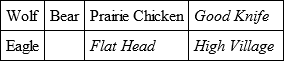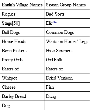Of the Yankton gentes, five names out of seven were nicknames, mostly derisive, the sixth was 'Bad Nation' ('Rogues'), the seventh was a totem name, 'Wild Cat.' Of the Hunpatina (seven gentes), three names were totemic (Drifting Goose, Dogs, Eat no Buffalo Cows); the others were nicknames, such as 'Eat the Scrapings of Hides.' Of the Sitcanxu, there were thirteen gentes. Six or seven of their titles were nicknames, three were totemic, the others were dubious, such as 'Smellers of Fish.' The Itaziptec had seven gentes; of their names all were nicknames, including 'Eat dried venison from the hind quarter.' Of the Minikooju, there were nine gentes. Eight names were nicknames, including 'Dung Eaters.' One seems totemic, 'Eat no Dogs.' Of five Asineboin gentes the names were nicknames from the habits or localities of the communities. One was 'Girl's Band,' that is, 'Girls.'