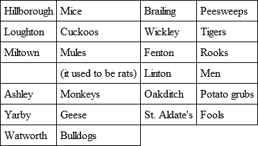 I select illustrative examples from the blason populaire of modern folk-lore. Here we find the use of plant and animal names for neighbouring groups, villages, or parishes. Thus two informants in a rural district of Cornwall, living at a village which I shall call Loughton, found that, when they walked through the neighbouring village, Hillborough, the little boys 'called cuckoo at the sight of us.' They learned that the cuckoo was the badge, in folk-lore, of their village. An ancient carved and gilded dove in the Loughton church 'was firmly believed by many of the inhabitants to be a representation of the Loughton Cuckoo,' and all Loughton folk were Cuckoos. 'It seems as if the inhabitants do not care to talk about these things, for some reason or other.' A travelled Loughtonian 'believes the animal names and symbols to be very ancient, and that each village has its symbol.' My informants think that 'some modern badges have been substituted for more ancient ones,' such as tiger and monkey. There is apparently no veneration of the local beast, bird, or insect, which seems often, on the other hand, to have been imposed from without as a token of derision. Australians make a great totem of the Witchetty Grub (as Spencer and Gillen report), but the village of Oakditch is not proud of its potato grub, the natives themselves being styled 'tater grubs.' I append a list of villages (with false names230) and of their badges: