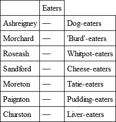In the following village sobriquets from the south-western counties of England the people are styled 'eaters of' this or that.328